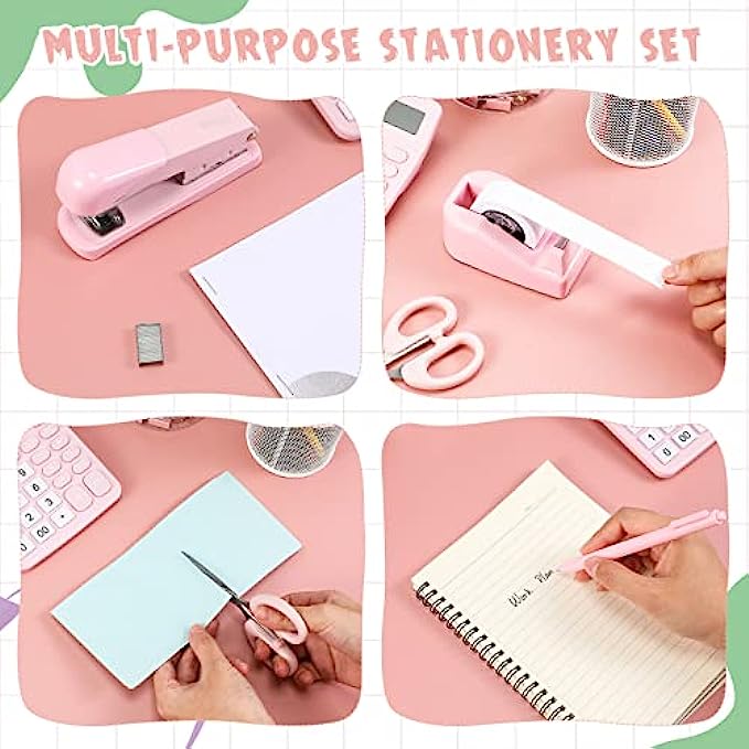 • Value Pack: you can get 1 stapler, 1 desktop tape dispenser, 1 ballpoint pen, 1 box of binder clips and paper clips, 1 scissor and 1 calculator, such a complete office supplies combination is enough to meet your study or office needs